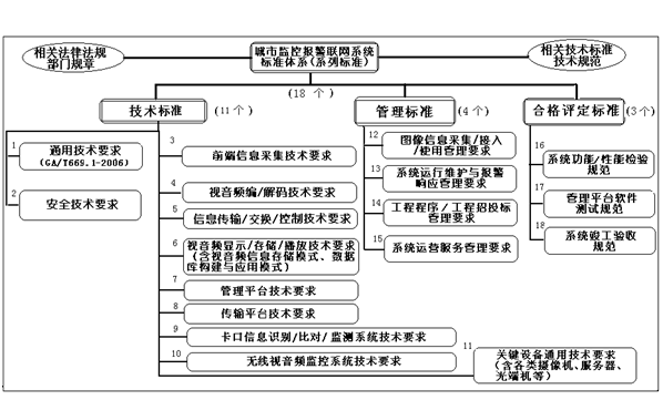 二、城市監(jiān)控報警聯(lián)網系統(tǒng)標準體系(共18項標準:技術標準11項、管理標準4項、合格評定標準3 項)