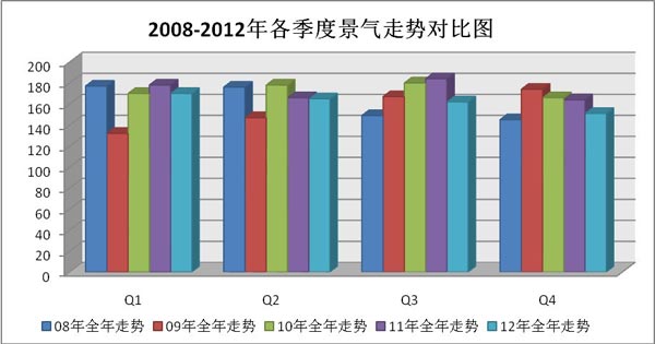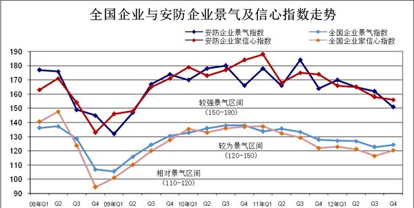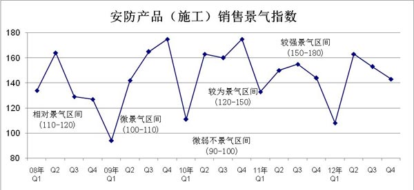 安防由于歷史較短,規(guī)模較小,在國民經(jīng)濟(jì)核算中還沒有作為一個獨立行業(yè),因此相應(yīng)的行業(yè)統(tǒng)計調(diào)查制度和調(diào)查體系都沒有建立起來,對行業(yè)發(fā)展規(guī)模、速度、結(jié)構(gòu)、布局、市場、趨勢,以及企業(yè)投入、效益等等情況都無法進(jìn)行科學(xué)的衡量,對存在的問題無法及時反映。自2008年起,《中國安防》雜志編輯部開始按季度進(jìn)行安防行業(yè)景氣調(diào)查并發(fā)布相關(guān)信息,現(xiàn)將2012年全年情況分析如下。
