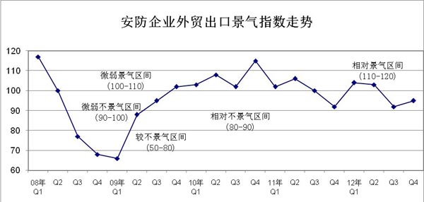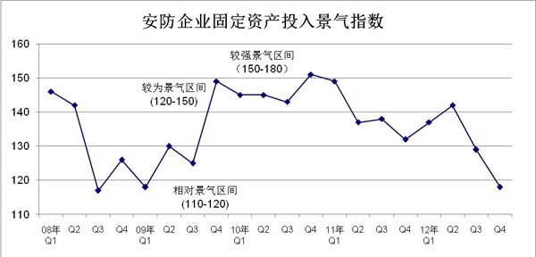 受各方面因素影響,2012年前三季度安防外貿(mào)出口景氣度也出現(xiàn)三連陰,一度從微弱景氣區(qū)間跌落到微弱不景氣區(qū)間,到四季度才稍有回暖。(見圖4)圖4安防企業(yè)固定資產(chǎn)投入景氣指數(shù)同樣走出一揚(yáng)三挫的局面,僅在第一季度出現(xiàn)環(huán)比上漲,此后連續(xù)三個季度都出現(xiàn)下行,而且在第四季度從“較為景氣區(qū)間”跌至“相對景氣區(qū)間”,該季度也同比成為自金融危機(jī)時期以來的歷史最低水平。(見圖5)。