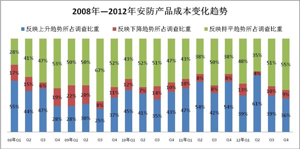 從2012年安防產(chǎn)品的成本變化來看,第一、三、四季度,安防產(chǎn)品的成本變化趨于穩(wěn)定,反映成本上升的比重基本維持在39%和36%。只有第二季度出現(xiàn)大幅度波動,其中,反映成本上升的比重達(dá)到61%,達(dá)到了調(diào)查歷史以來最高水平。(見圖7)