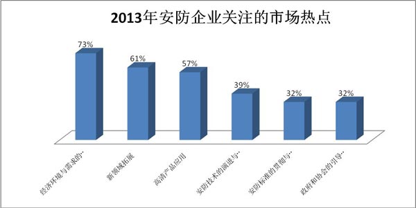 2012年,安防行業(yè)遭遇歷史性下滑,全年四季度連續(xù)出現(xiàn)下行態(tài)勢。這讓我們對明年的市場發(fā)展和走向有了更多的期待。從調(diào)查情況來看,2013年安防企業(yè)關(guān)注的重點集中在外部環(huán)境、新領(lǐng)域和高新應(yīng)用等幾方面。其中,安防企業(yè)對外部經(jīng)濟(jì)環(huán)境和市場需求的變化關(guān)注程度最高,占調(diào)查比例的73%;其次對新領(lǐng)域的拓展和高清產(chǎn)品的應(yīng)用也保持了濃厚的興趣,占調(diào)查比例的61%和57%。(見圖8)