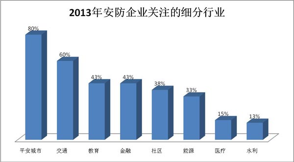 而從關(guān)注的行業(yè)來看,平安城市仍然是明年安防企業(yè)關(guān)注的最大焦點,有80%的企業(yè)對該領(lǐng)域給予關(guān)注;而有60%和43%的企業(yè)對交通、教育和金融有很高期待;此外,社區(qū)和能源領(lǐng)域也保持了相對高的關(guān)注度,而前幾年較為熱門的醫(yī)療和水利領(lǐng)域,關(guān)注程度略有減少。(見圖9)