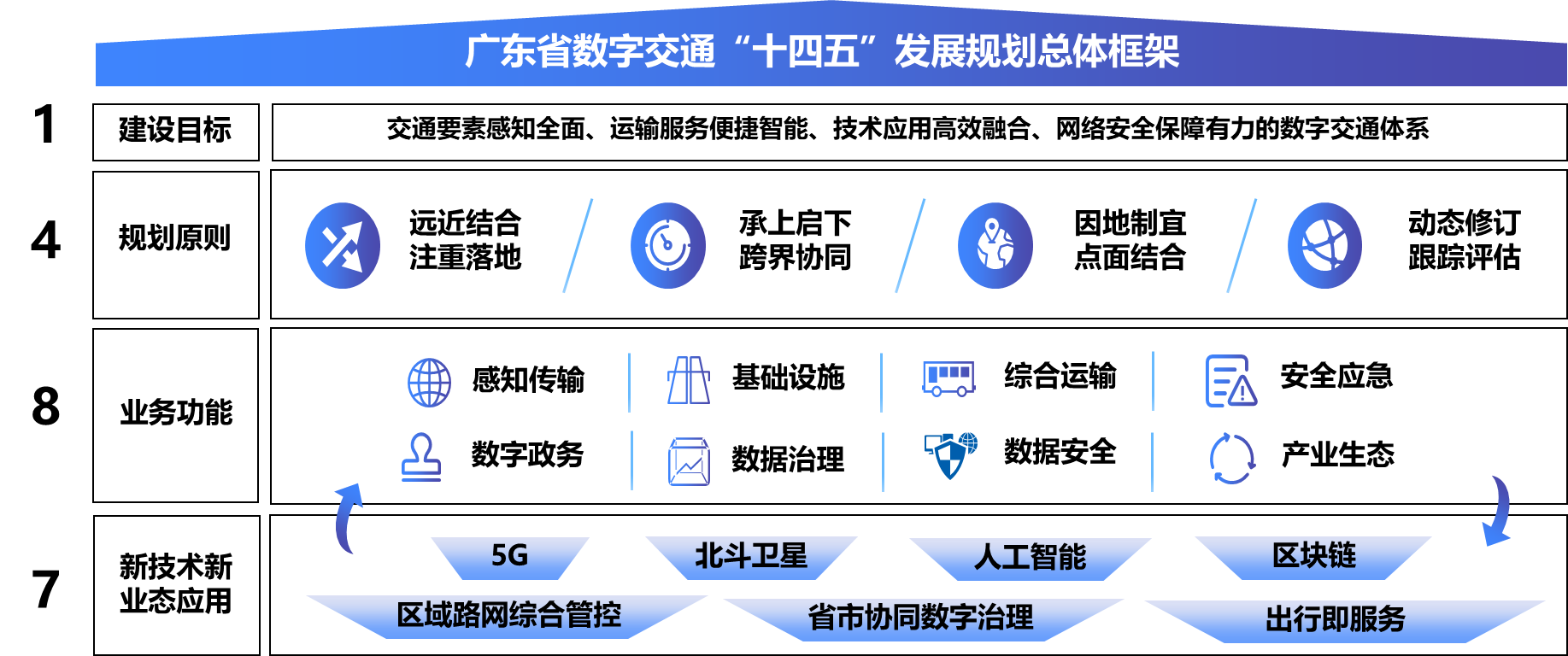 --省交通运输厅印发了《广东省"数字交通运输厅"建设总体规划(2020-2022年)》、《"数字交通运输厅"总体架构及相关要求的通知》。构建"1168"(一张感知传输网、一个粤交通特色品牌、六大类数字化支撑能力、八大业务协同平台)数字信息化体系。